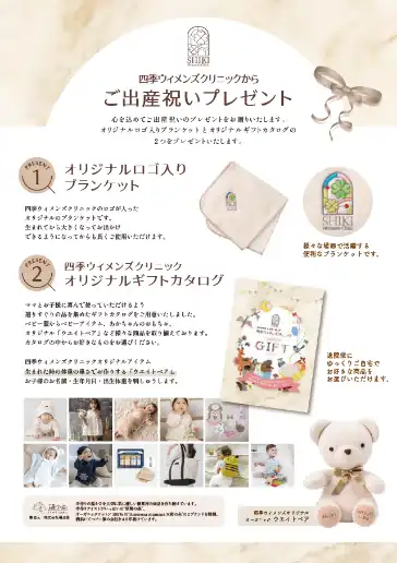 当院では「オリジナルロゴ入りブランケット」「オリジナルギフトカタログ」などのプレゼントをご用意しています。